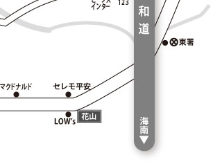 阪和自動車道 和歌山ICから和歌山方面へ一般道へ合流後、直進。太田の交差点を右折し、左にセルフGS、右に紀陽銀行の交差点を越えると、すぐ左手。約10分。