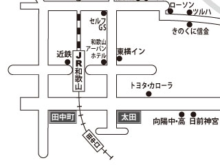 JR和歌山駅下車、東口より出てそのまま直進。左手前に和歌山アーバンホテルのビルがある交差点を左折後直進。左にセルフGS、右に紀陽銀行の交差点を渡ると、すぐ左手。徒歩約10分。